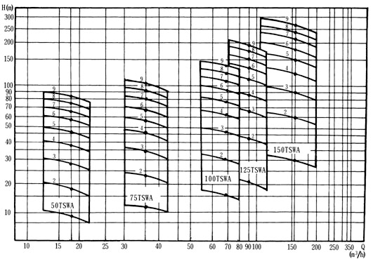 TSWA型多級離心泵全系列共5個品種40個規(guī)格,其性能范圍流量Q=1.5~191m3/h,揚程h=17~247m,轉(zhuǎn)速n=1450r/min。